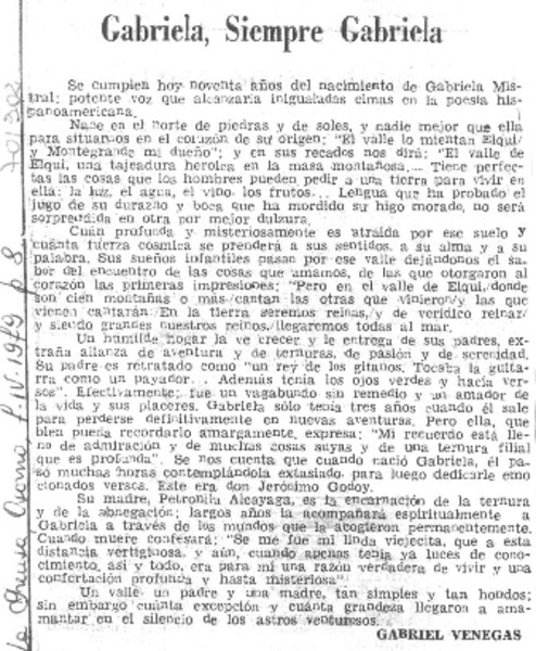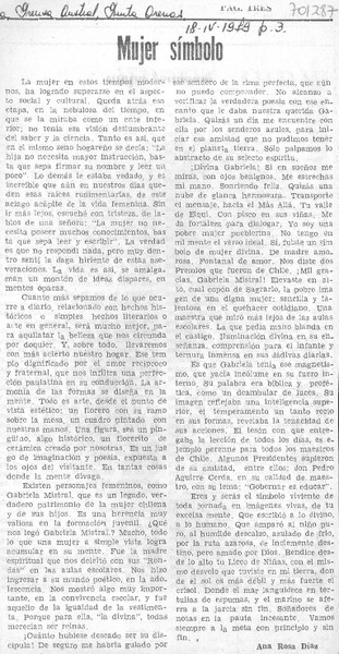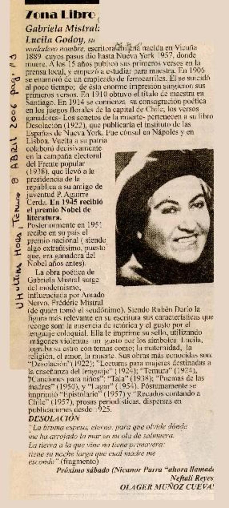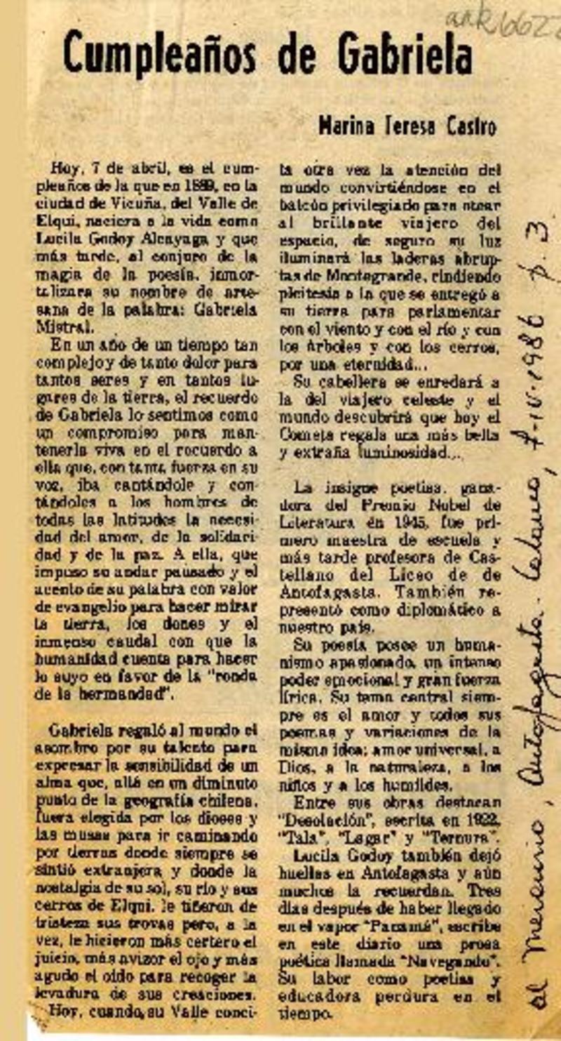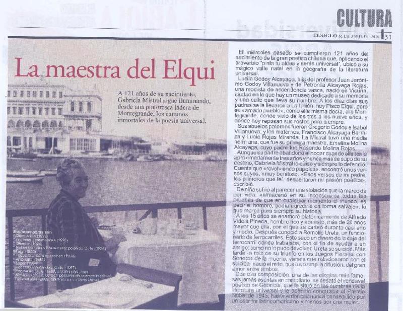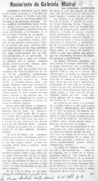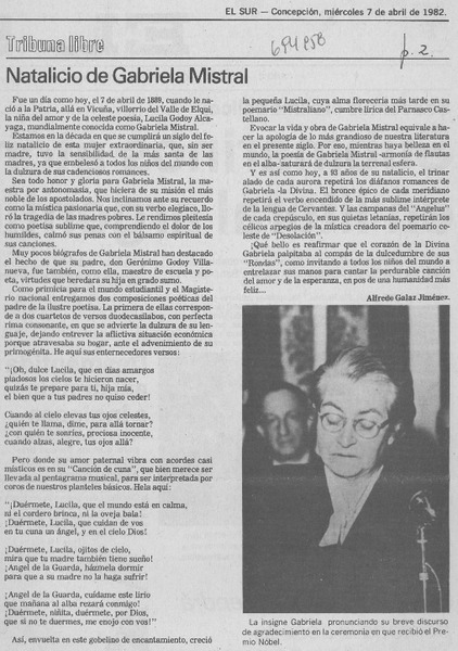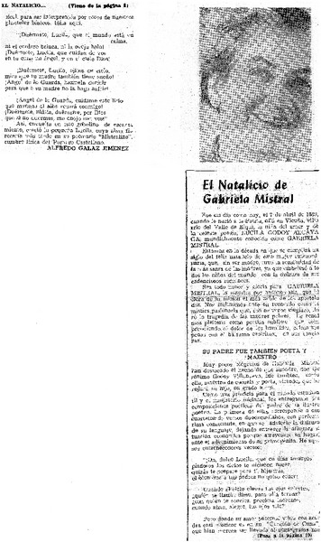 Natalicio de Gabriela Mistral [artículo] Alfredo Galaz JIménez.