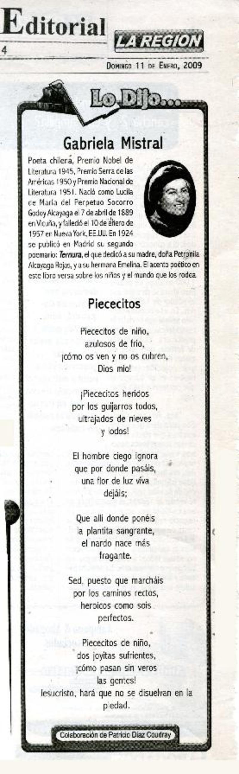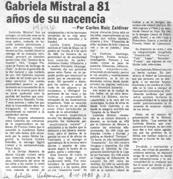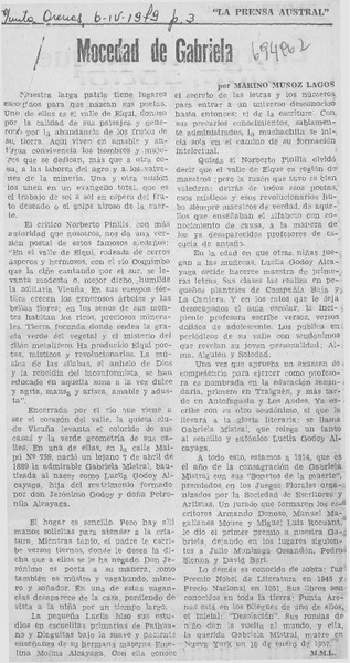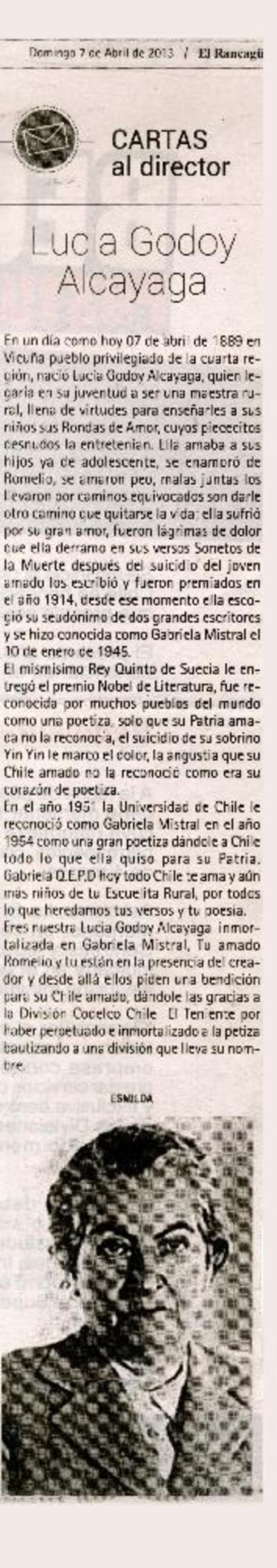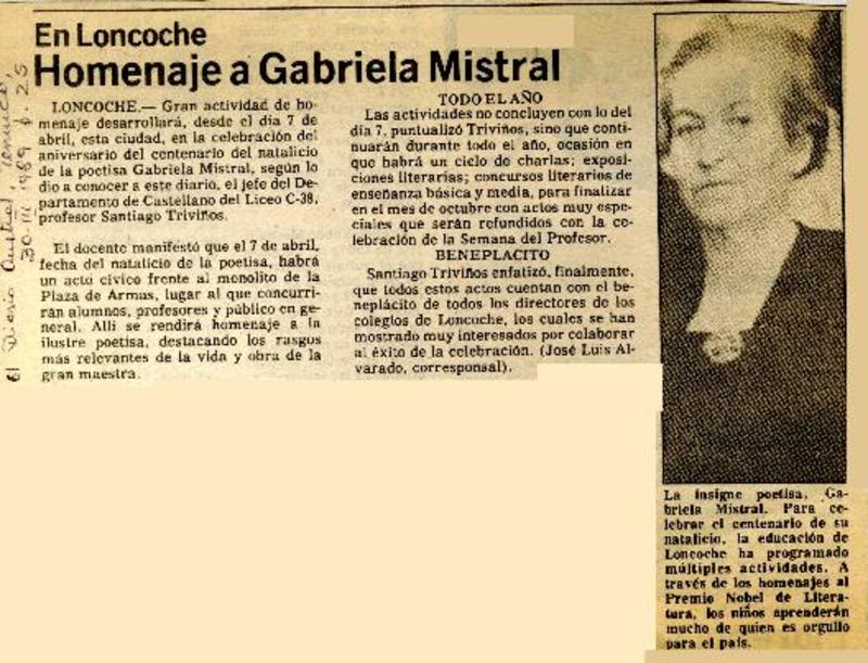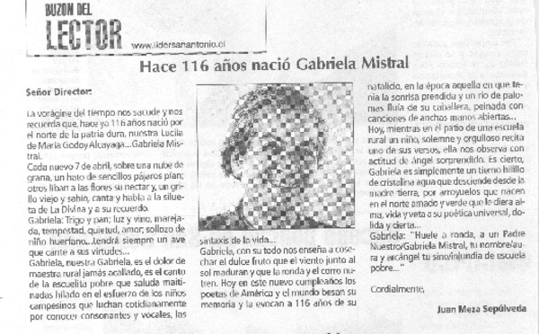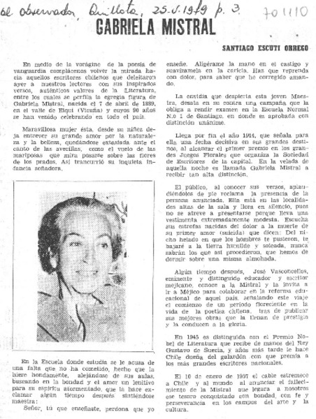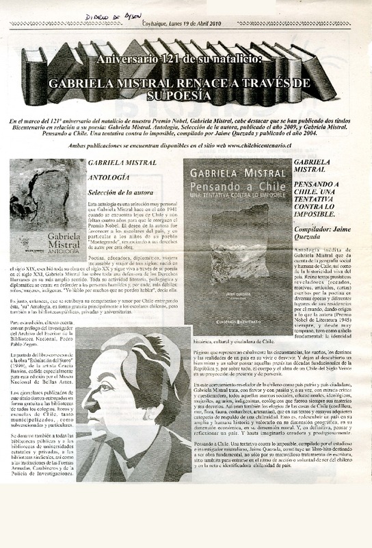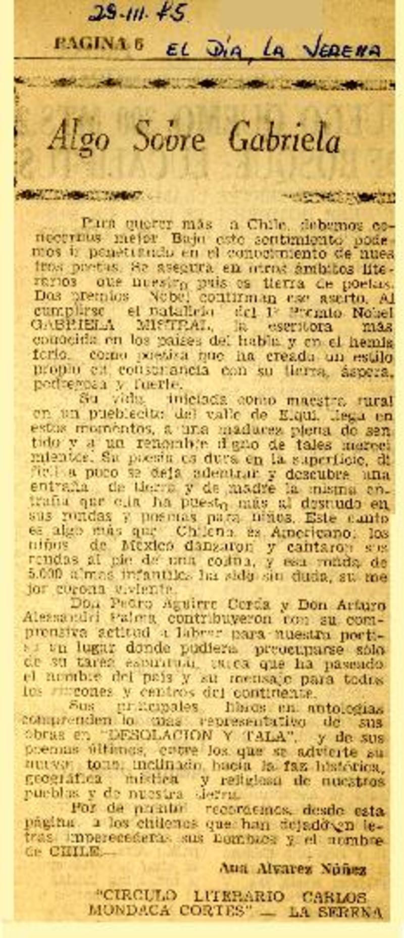 Natalicio de Gabriela Mistral [artículo] Alfredo Galaz JIménez.