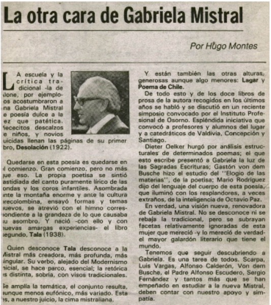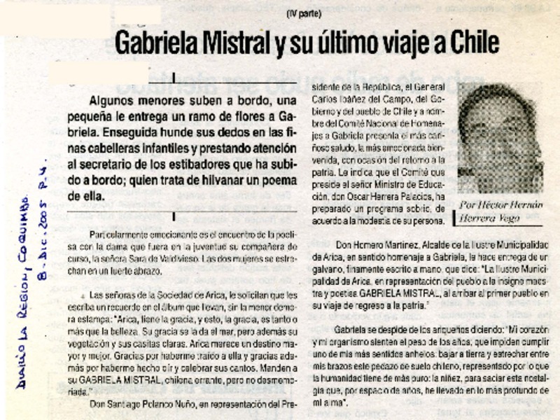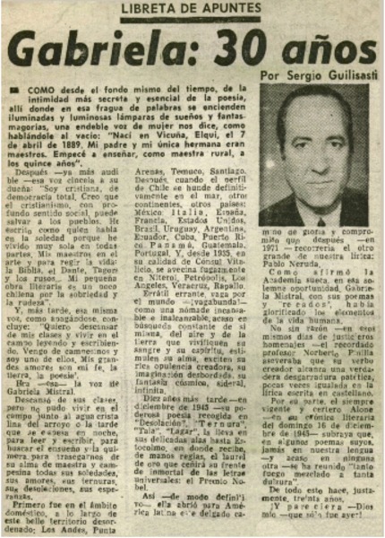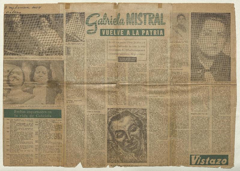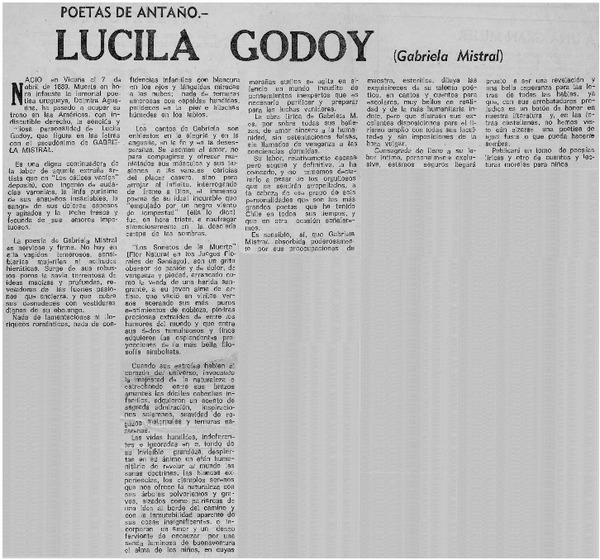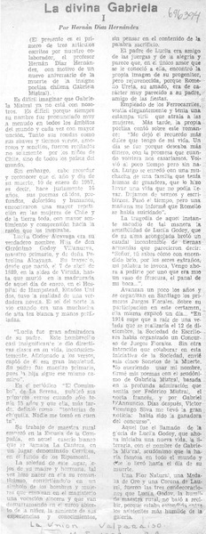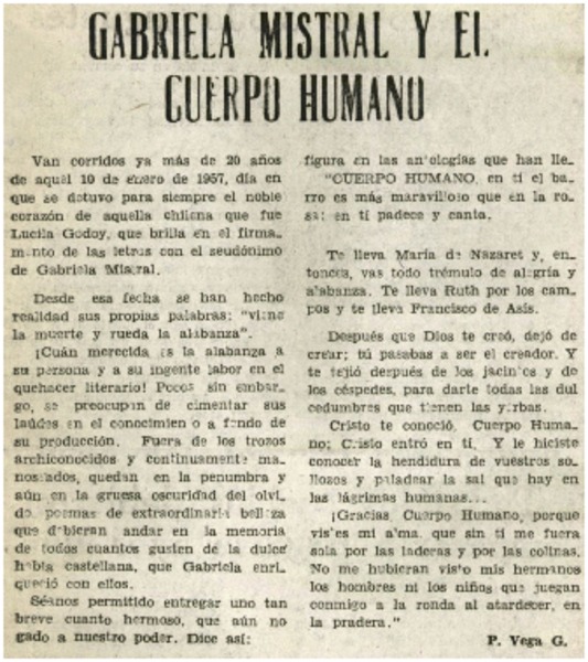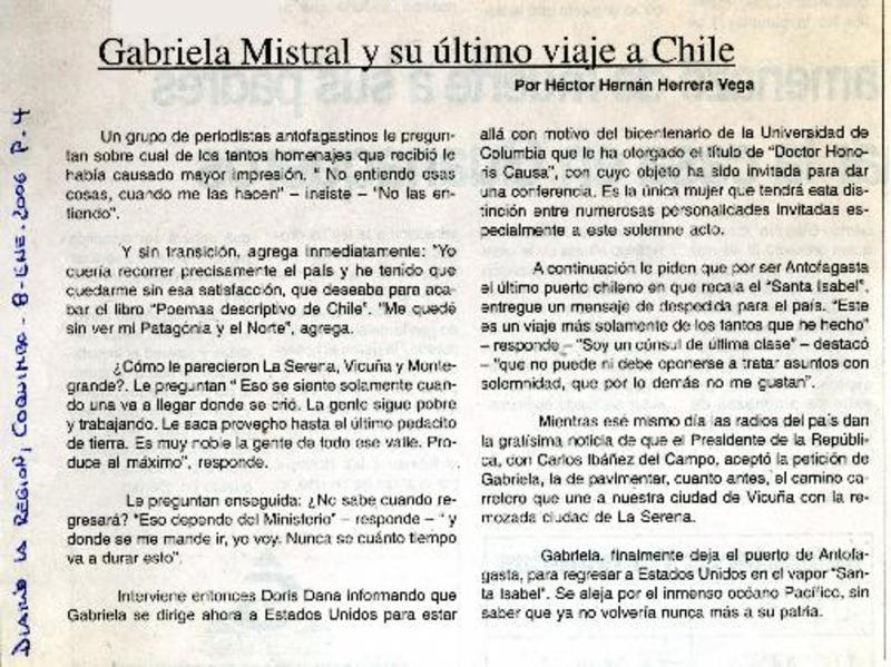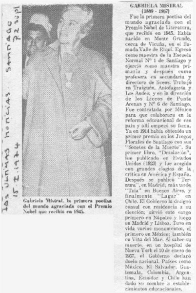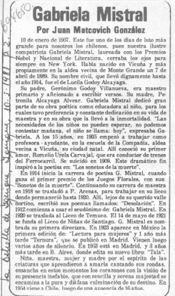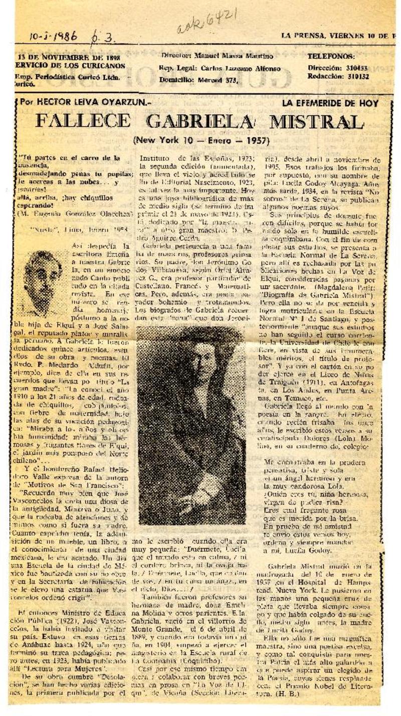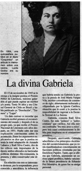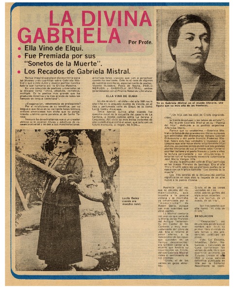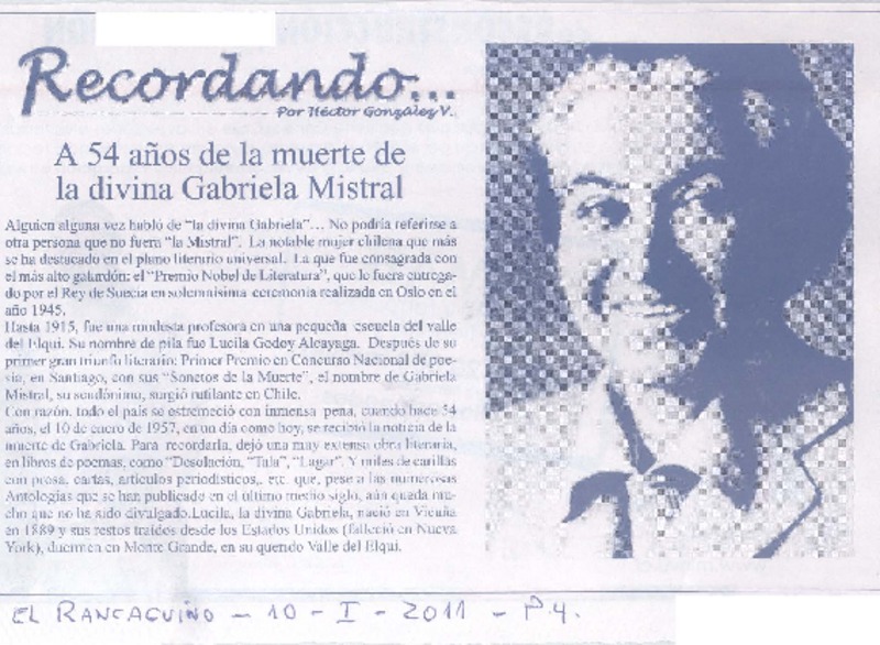 A 54 años de la muerte de la divina Gabriela Mistral [artículo] Héctor González V.