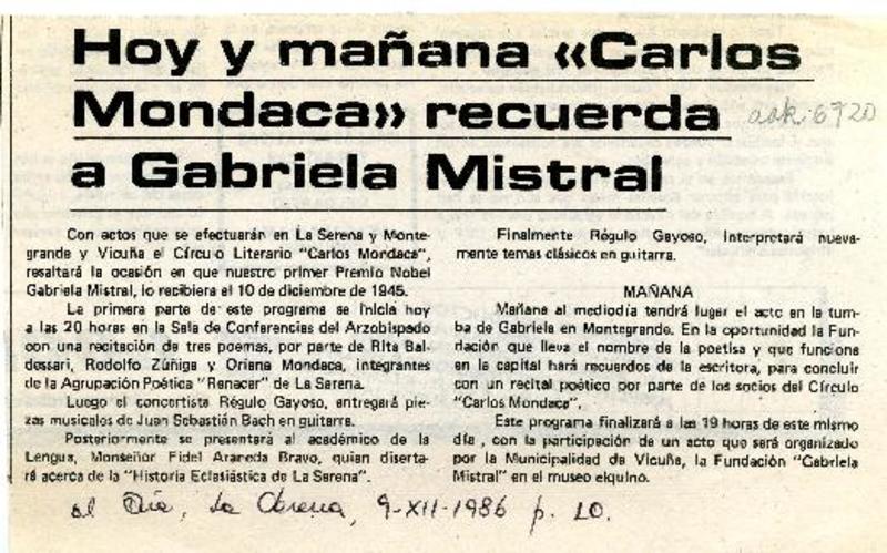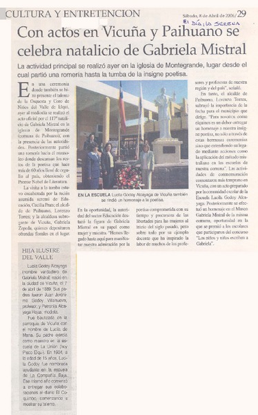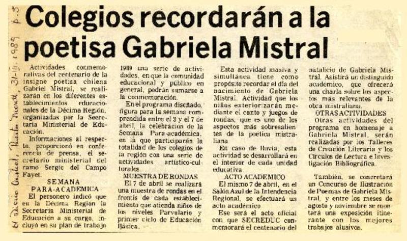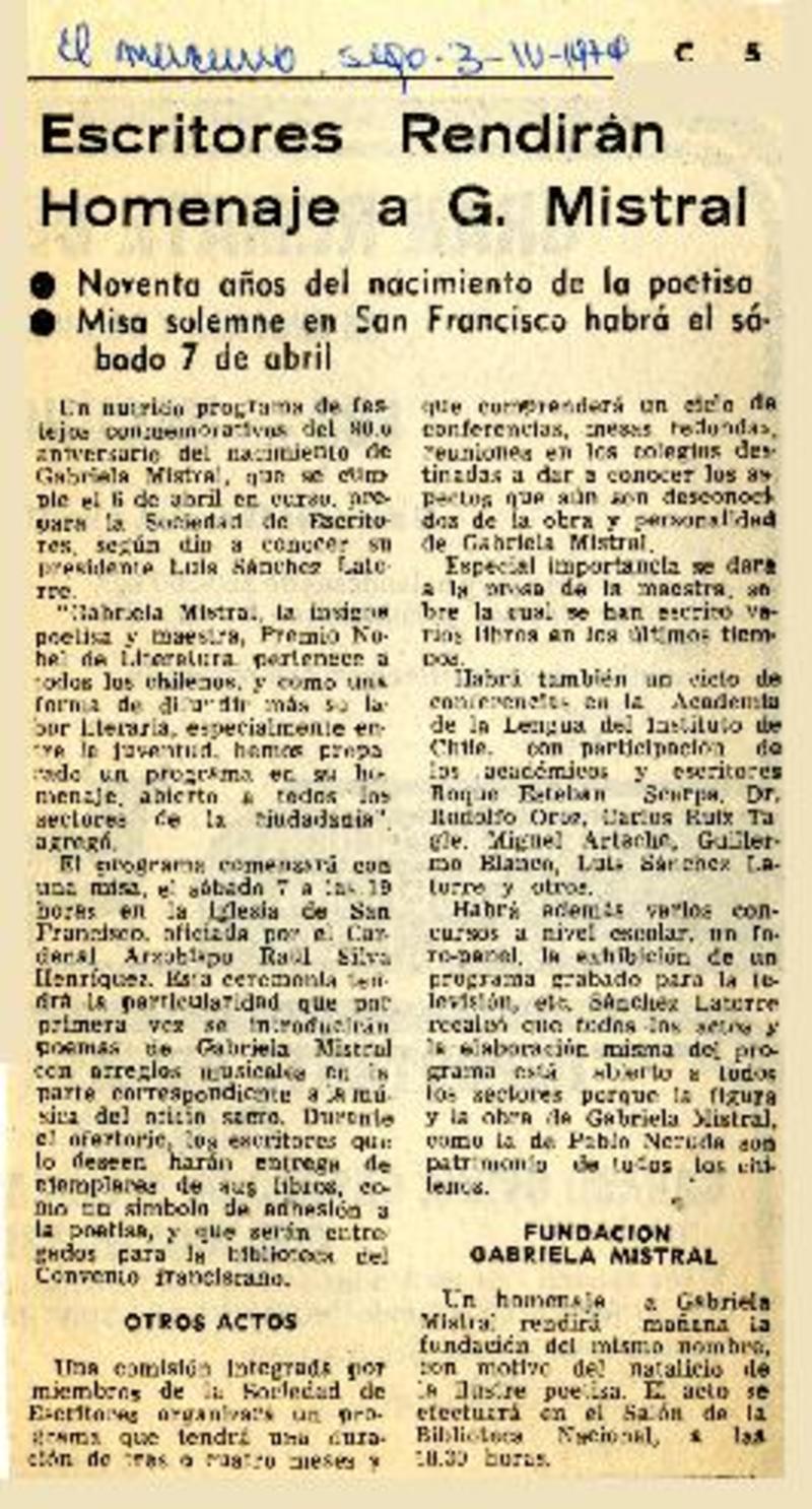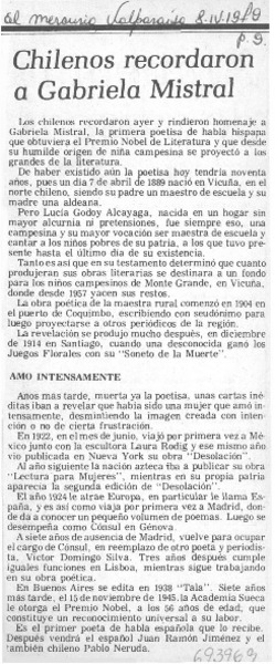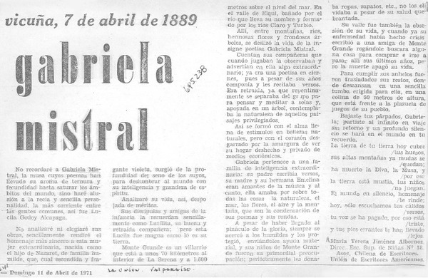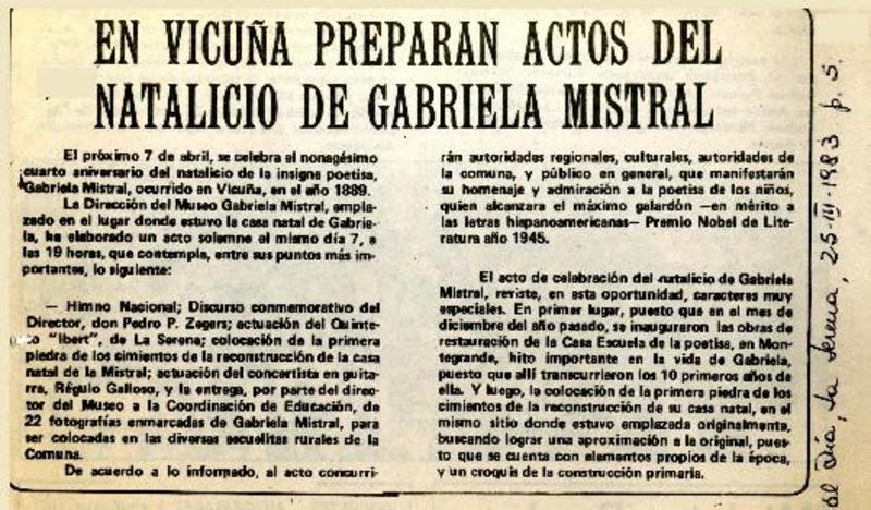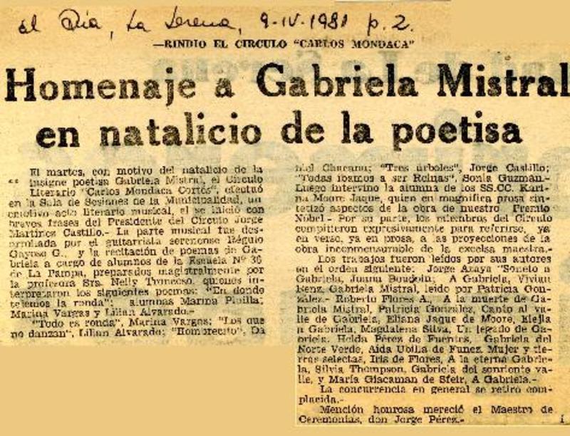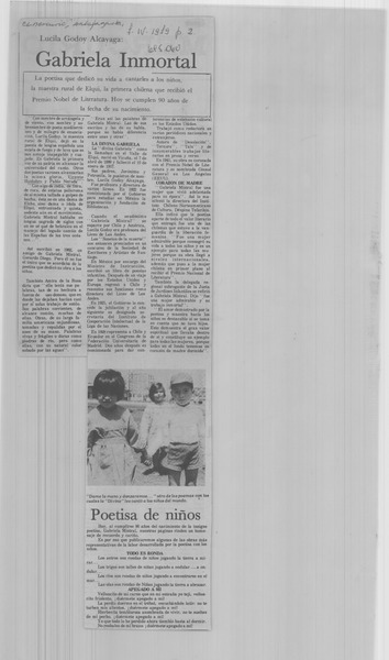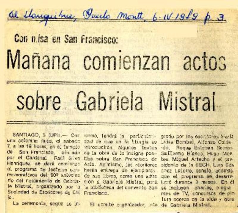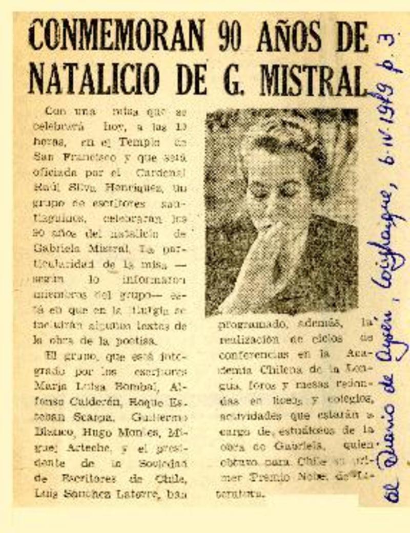 Natalicio de Gabriela Mistral conmemoran hoy. [artículo]