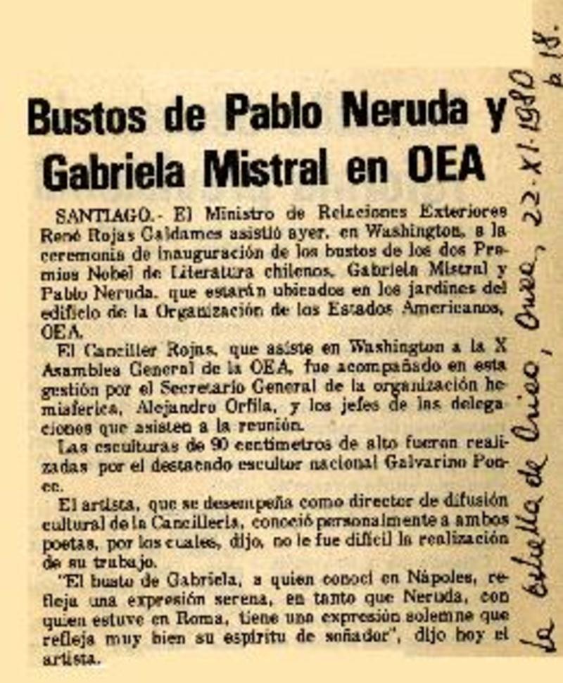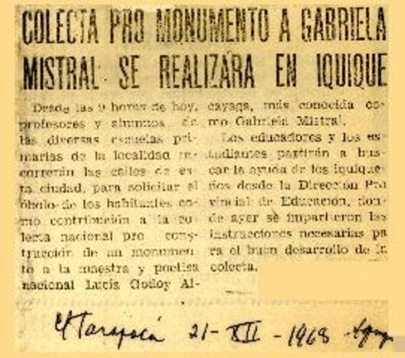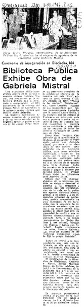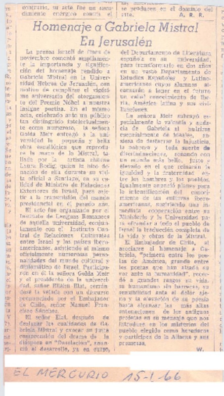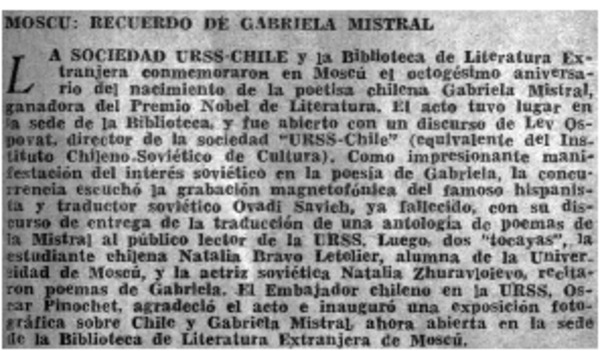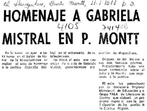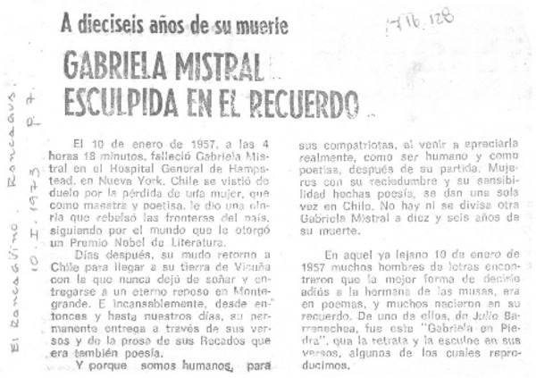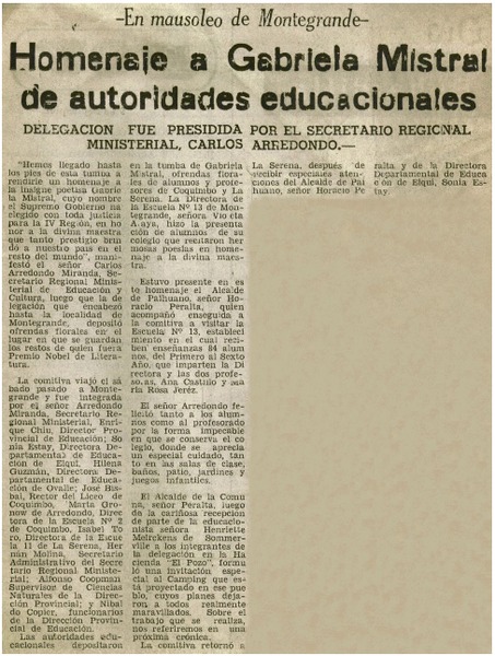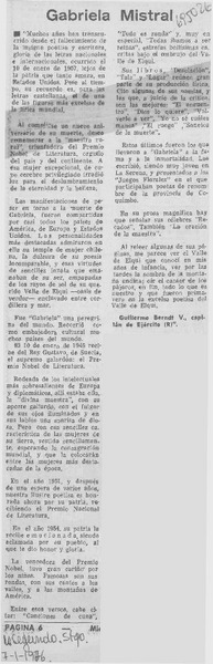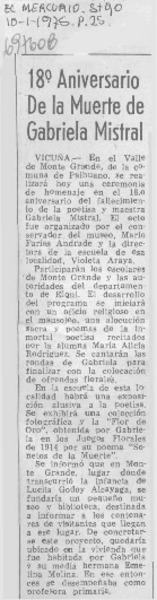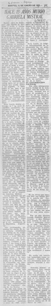 18° aniversario de la muerte de Gabriela Mistral. [artículo]