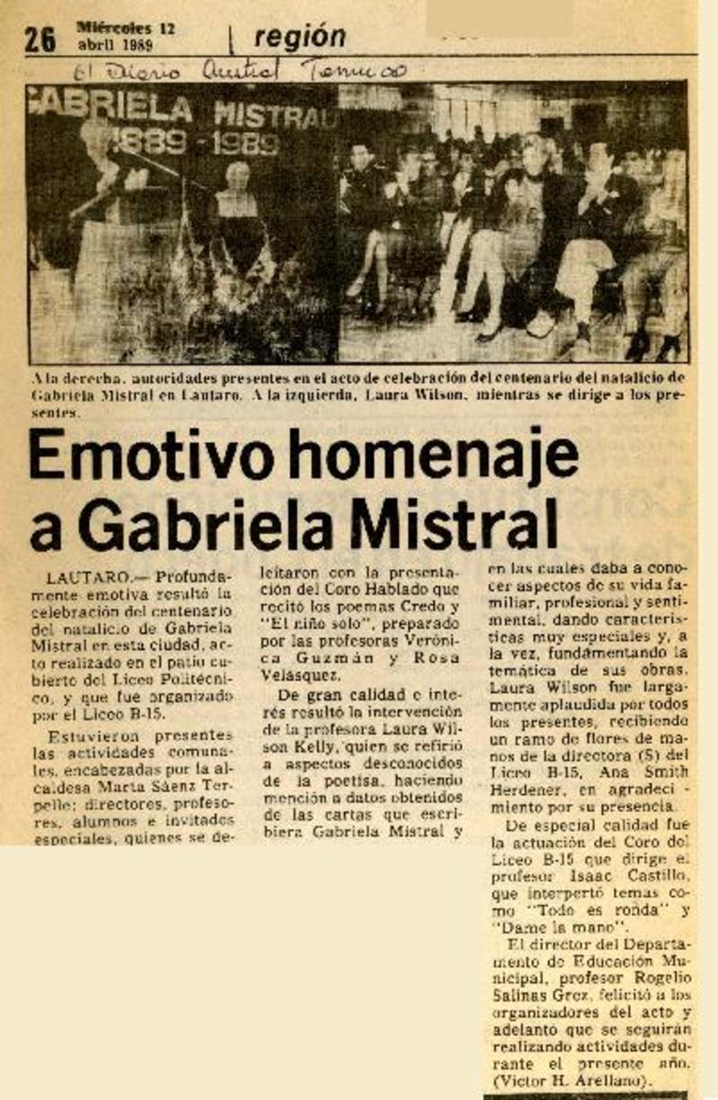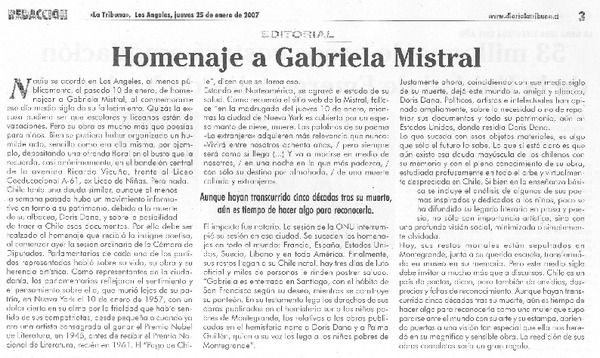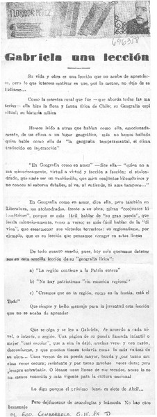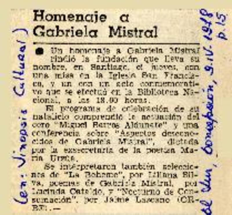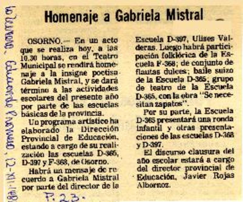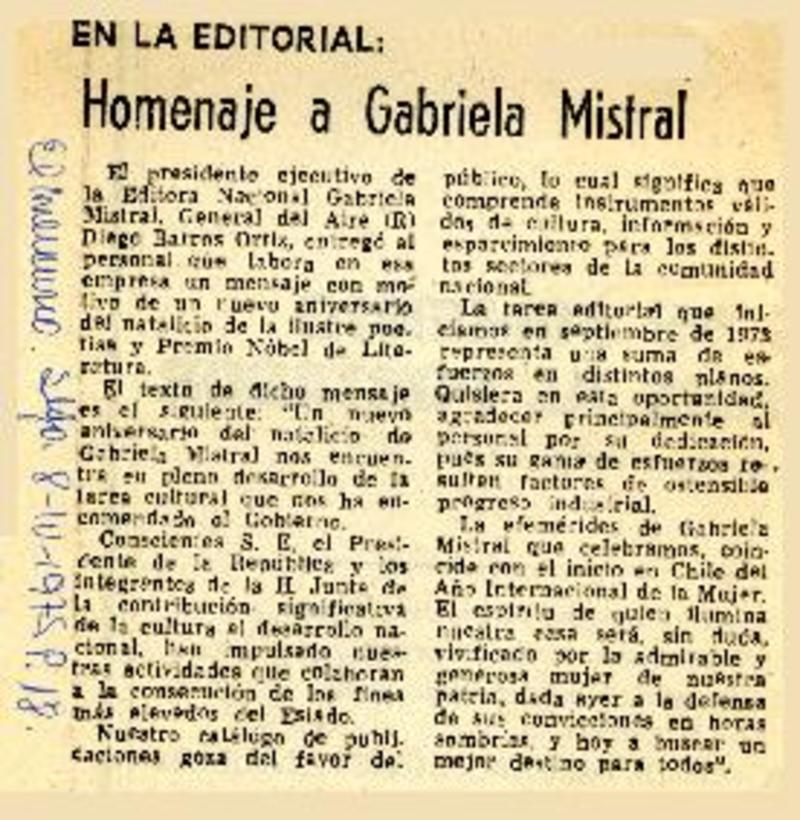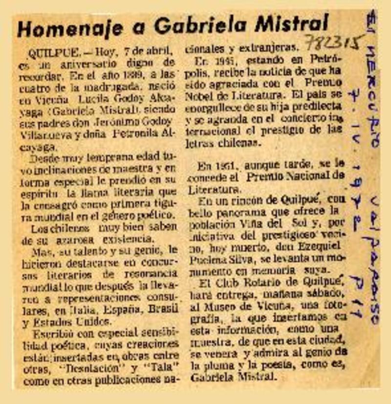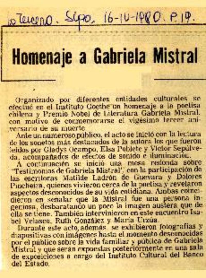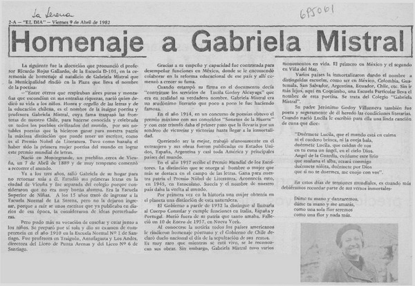Nuestro homenaje a Gabriela Mistral [artículo] Héctor Leiva Oyarzún.
