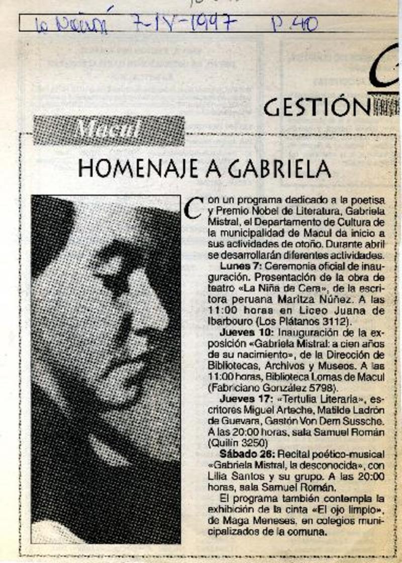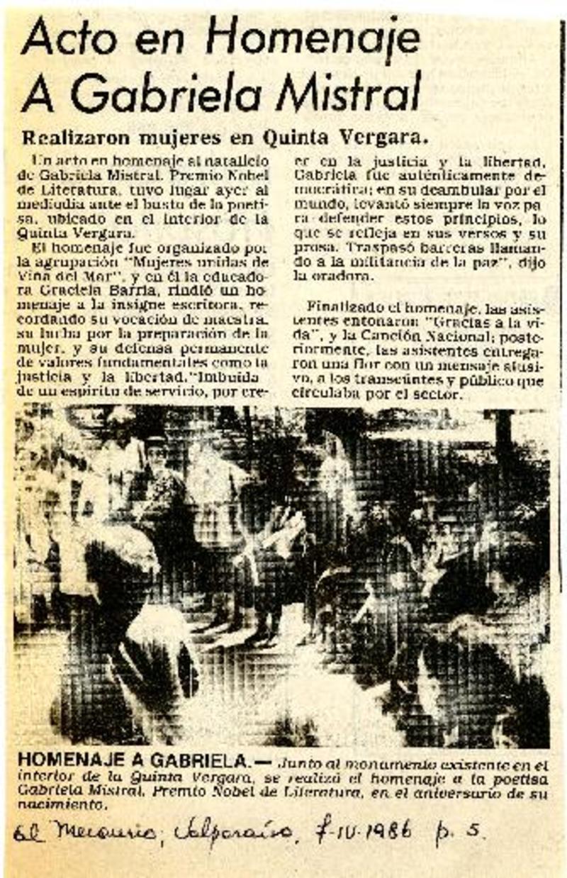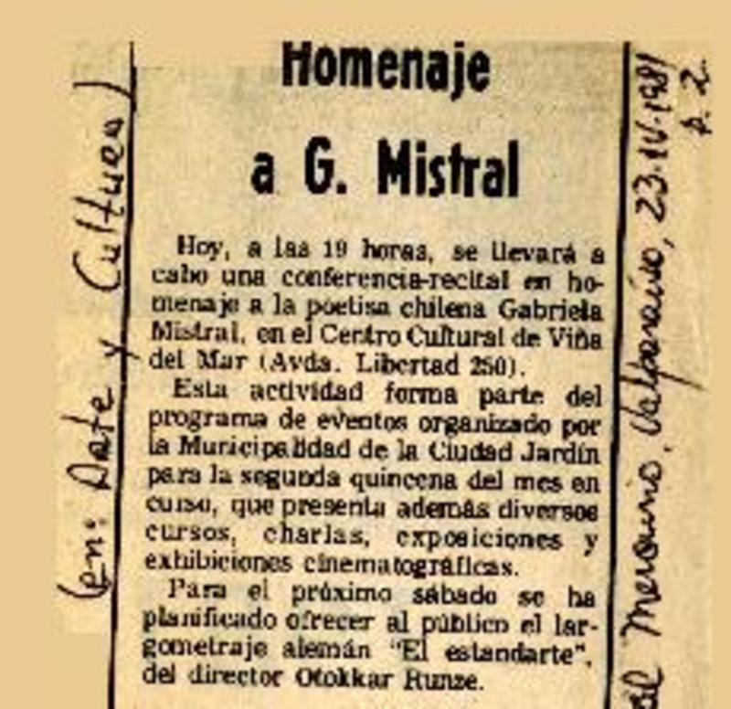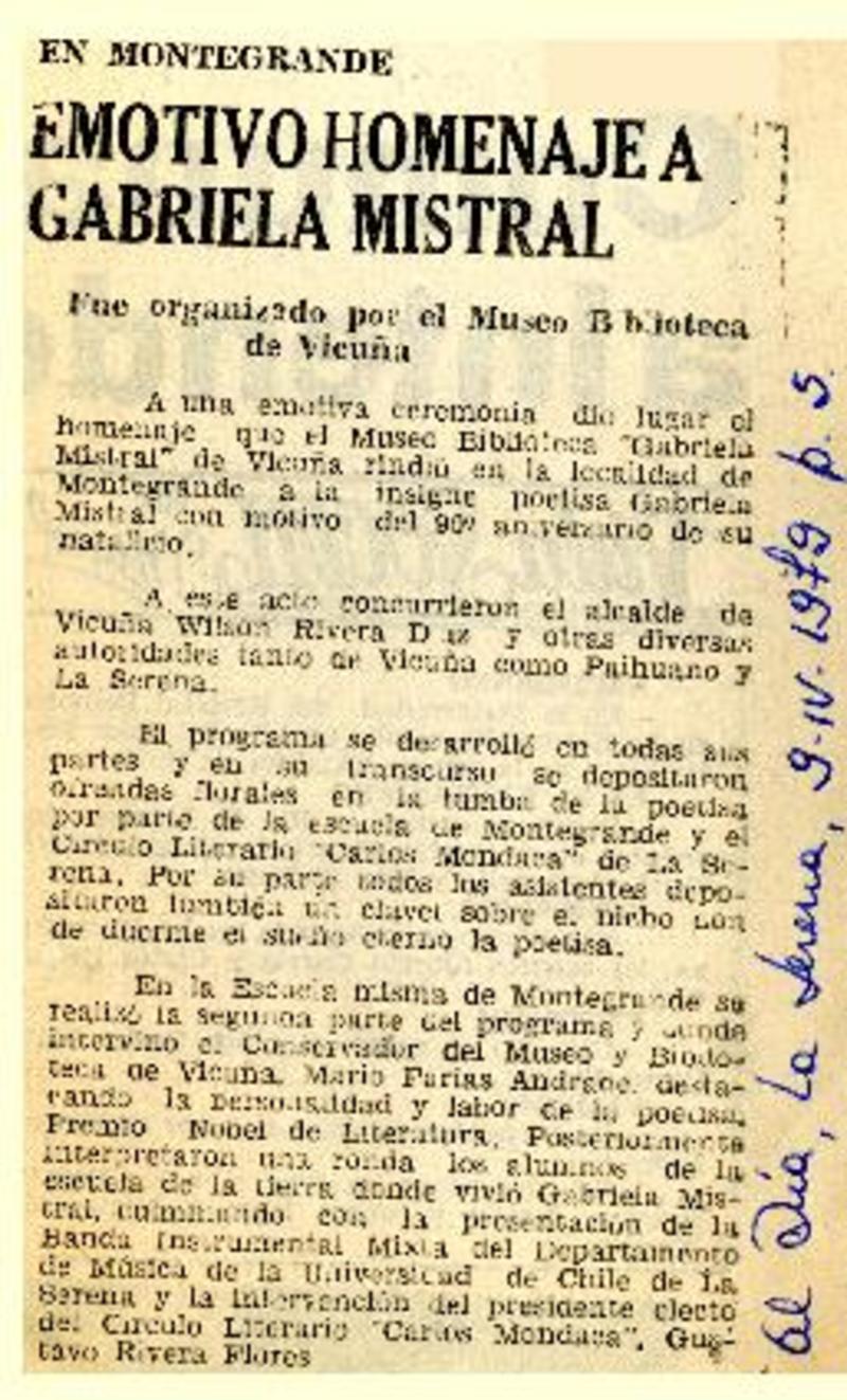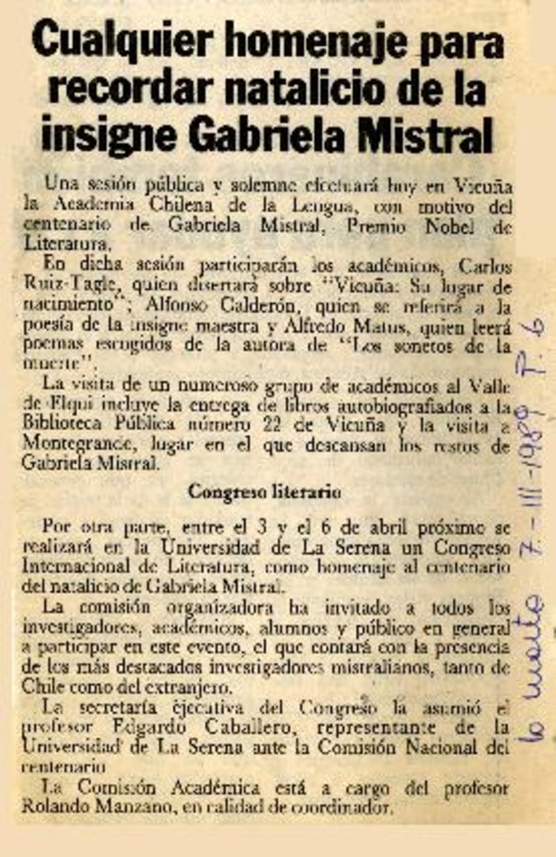 Nuestro homenaje a Gabriela Mistral [artículo] Héctor Leiva Oyarzún.