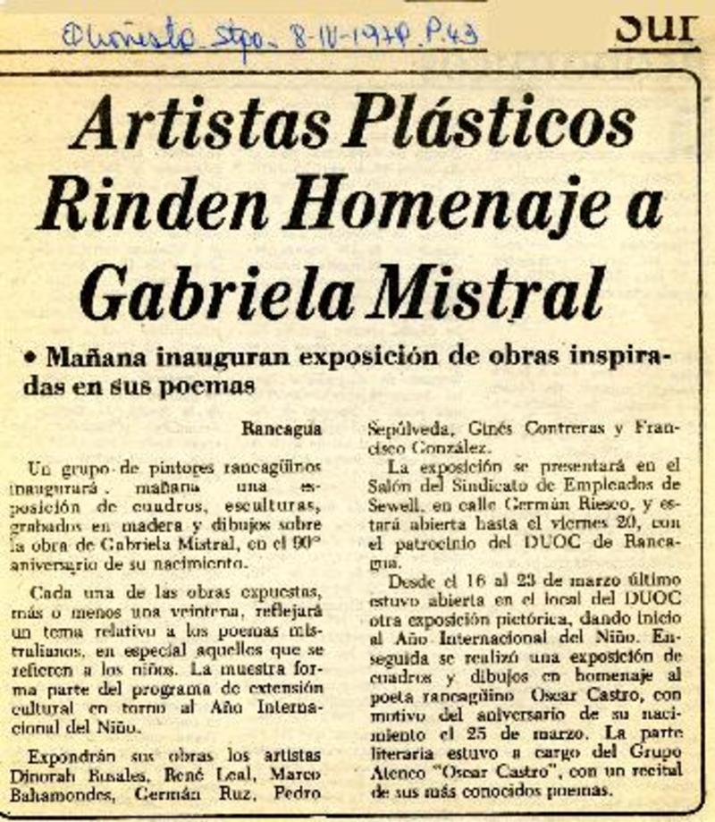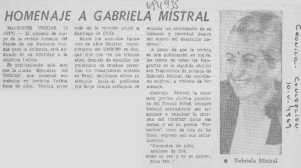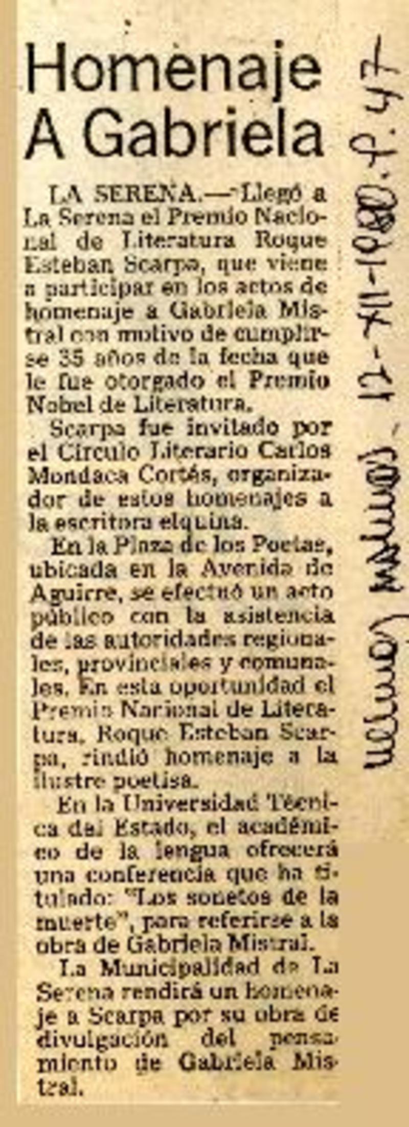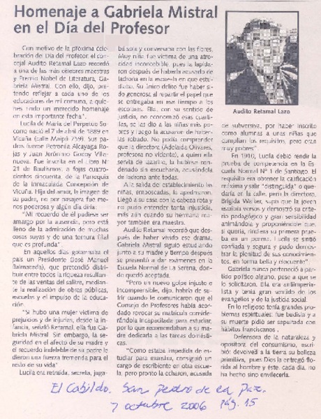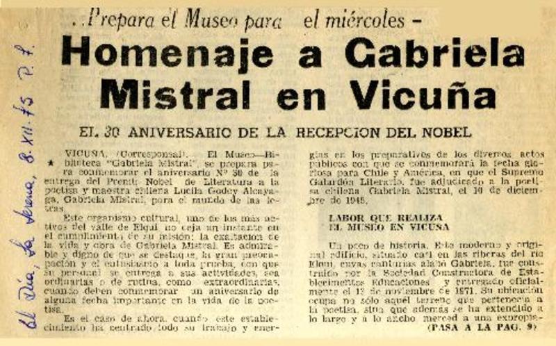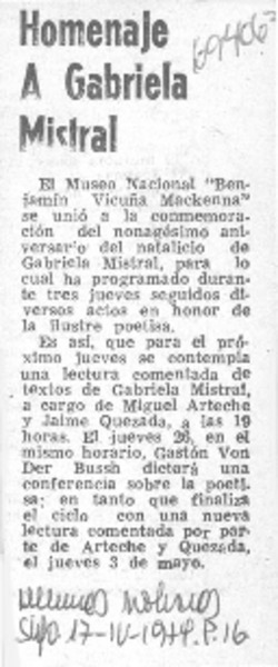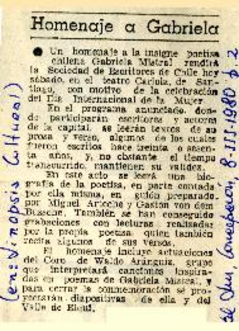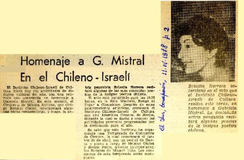 Nuestro homenaje a Gabriela Mistral [artículo] Héctor Leiva Oyarzún.