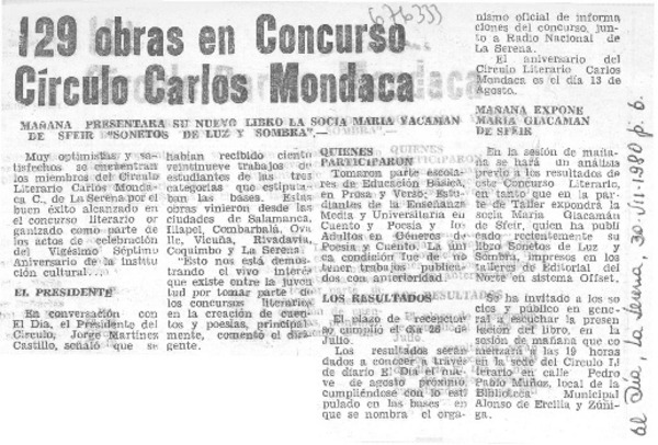 129 obras en concurso Círculo Carlos Mondaca. [artículo]