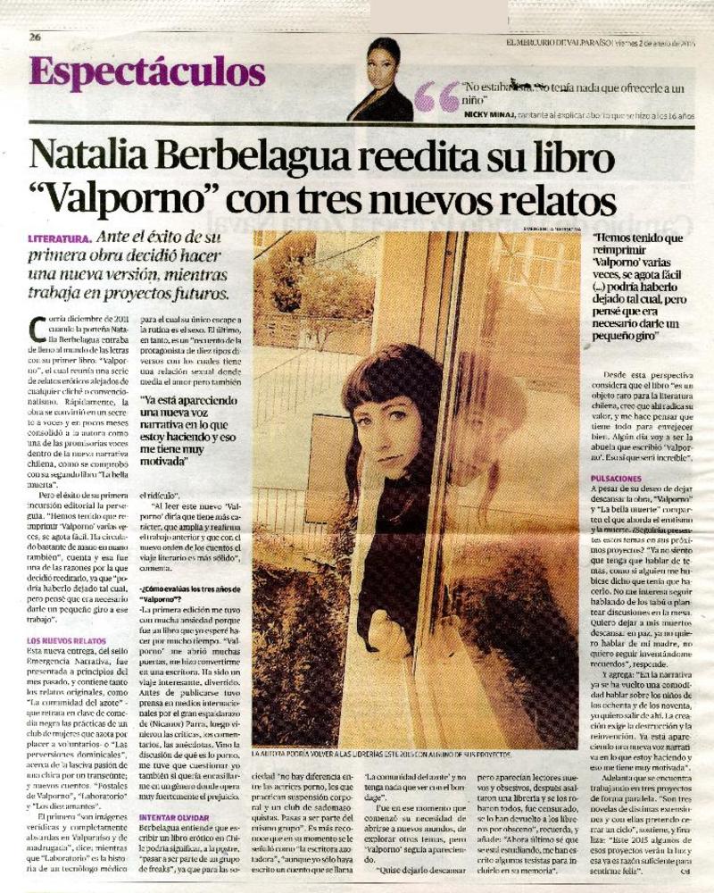 Natalia Berbelagua reedita su libro "valporno" con tres nuevos relatos [entrevista]. [artículo]