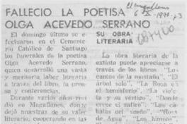 Falleció la poetisa Olga Acevedo Serrano. [artículo] El Magallanes (Punta Arenas, Chile)-- oct. 6, 1970, p. 3. .