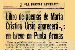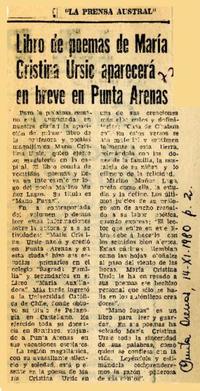 Libro de poemas de María Cristina Ursic aparecerá en breve en Punta Arenas. [artículo] La Prensa Austral (Punta Arenas, Chile)-- nov. 14, 1980, p. 2. .