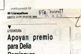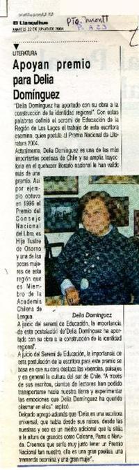 Apoyan premio para Delia Domínguez. [artículo] El Llanquihue (diario : Puerto Montt, Chile)-- jun. 22, 2004, p. A23. retr. .