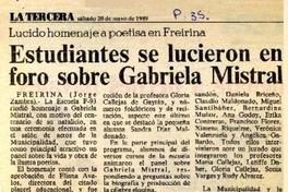 Estudiantes se lucieron en foro sobre Gabriela Mistral [artículo] La Tercera de la Hora (Diario : Santiago, Chile)-- mayo 20, 1989, p. 35. .