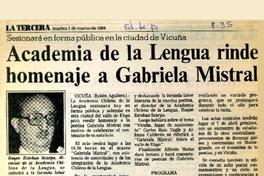Academia de la Lengua rinde homenaje a Gabriela Mistral [artículo] La Tercera de la Hora (Diario : Santiago, Chile)-- mar. 7, 1989, p. 35 (Ed. de Provicncia) retr. .