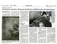 Hierbatera publica "Manual de Hierbas Medicinales de Aconcagua" [artículo] Roberto González S. El Trabajo (Diario : Los Andes, Chile)-- ago., 06, 2012, p. 6 .
