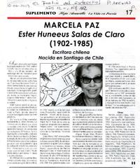Marcela Paz. Ester Huneeus Salas de Claro (1902-1985) Escritora chilena. Nacida en Santiago de Chile [artículo] / El Fortin del Estrecho (Periódico : Punta Arenas, Chile)-- n° 112 (jun. 2013), p. 17 (Suplemento Hoja Amarilla La Vida en Poesía) .