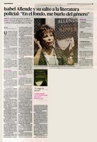 Isabel Allende y su salto a la literatura policial: "En el fondo, me burlo del género" [artículo] / El Diario de Aracama (Diario : Copiapó, Chile)-- ene. 22, 2014, p. 27 .