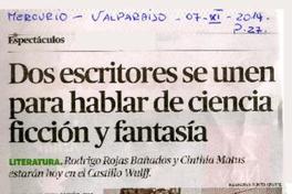 Dos escritores se unen para hablar de ciencia ficción y fantasía [artículo] / El Mercurio de Valparaíso (Diario : Chile) nov. 7, 2014, p. 27 .