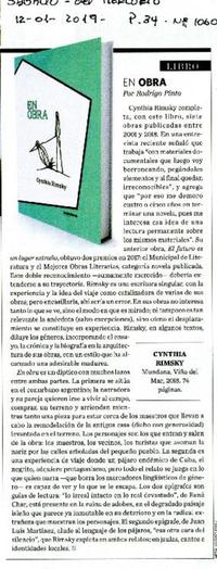 En obra [artículo] / Rodrigo Pinto. El Mercurio (Diario : Santiago, Chile)-- no. 1060 (ene. 12, 2019), p. 34. (suplemento "Sábado") .