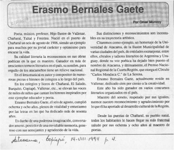 Erasmo Bernales Gaete [artículo] Omar Monroy.