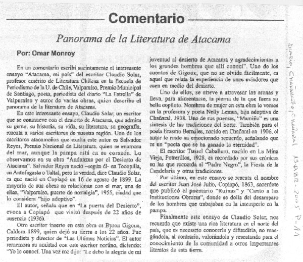 Panorama de la literatura de Atacama [artículo] Omar Monroy