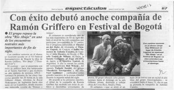 Con éxito debutó anoche compañía de Ramón Griffero en Festival de Bogatá  [artículo].