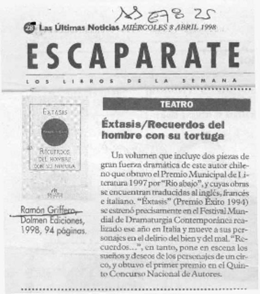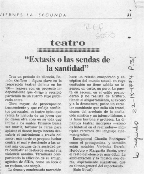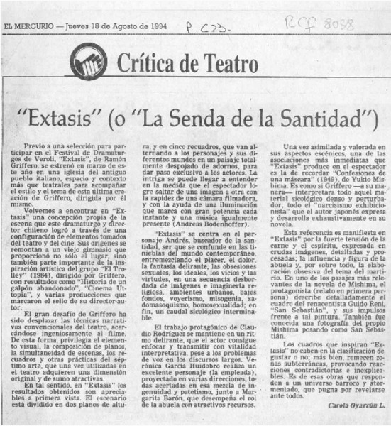 Harán lectura dramatizada de "Extasis" en Nueva York  [artículo] Ramón Griffero.