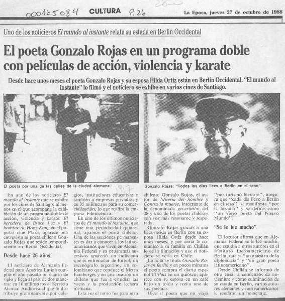 El Poeta Gonzalo Rojas en un programa doble con películas de acción, violencia y karate [artículo].