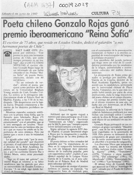 Poeta chileno Gonzalo Rojas ganó premio iberoamericano "Reina Sofía" [artículo].