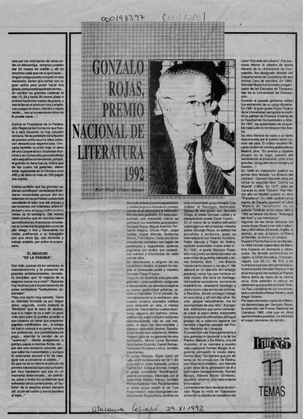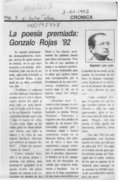 La poesía premiada, Gonzalo Rojas 92 [artículo] Alejandro Lara León.