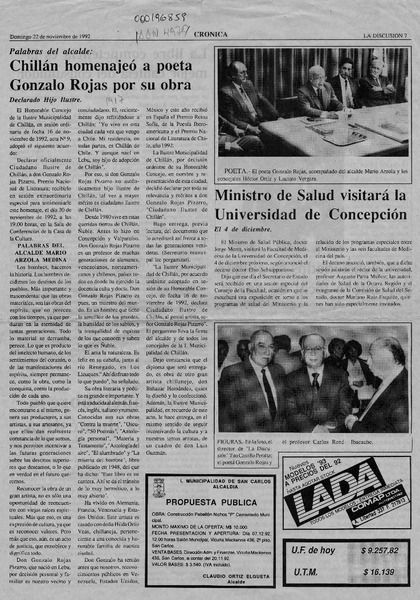 Chillán rendirá homenaje al poeta Gonzalo Rojas P. [artículo].