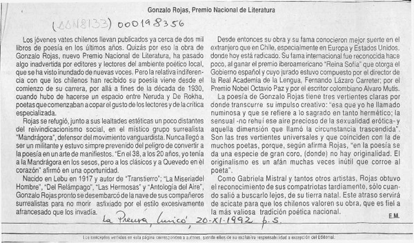 Gonzalo Rojas, Premio Nacional de Literatura [artículo] E. M.