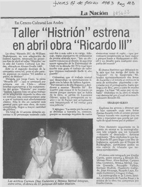 Taller "Histrión" estrena en abril "Ricardo III" [artículo]