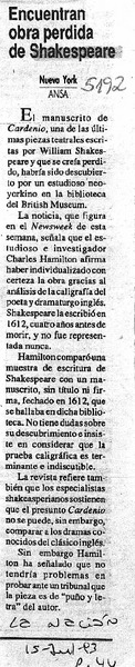 Encuentran una obra perdida de Shakespeare. [artículo]