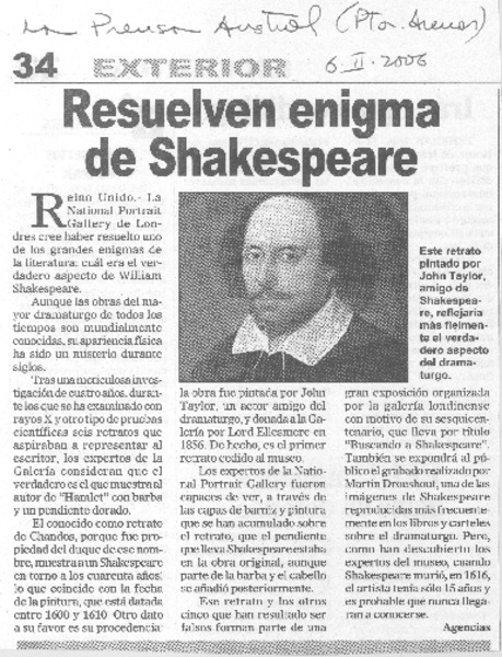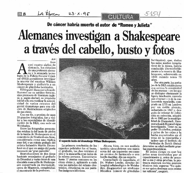 Alemanes investigan a Shakespeare a través del cabello, busto y fotos. [artículo]