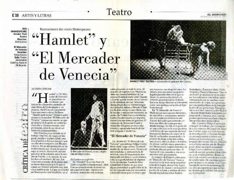 "Hamlet" y "El Mercader de Venecia" [artículo] Agustín Letelier.