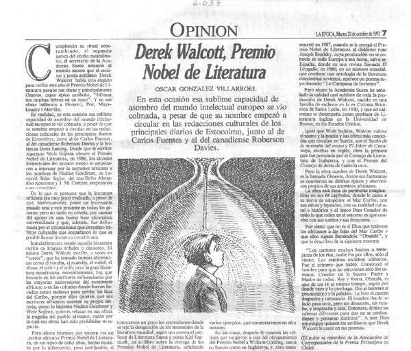 Dereck Walcott, Premio Nobel de Literatura [artículo] Oscar González Villarroel.