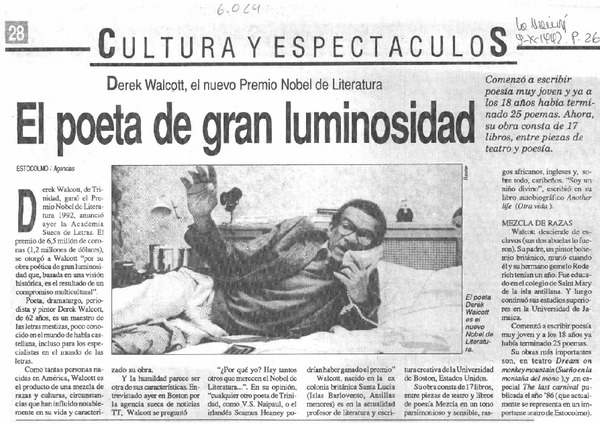 Por qué yo?", preguntó Derek Walcott, tras obtener Premio Nobel de Literatura. [artículo]