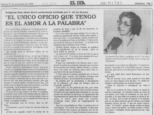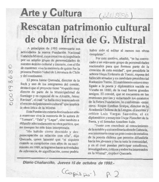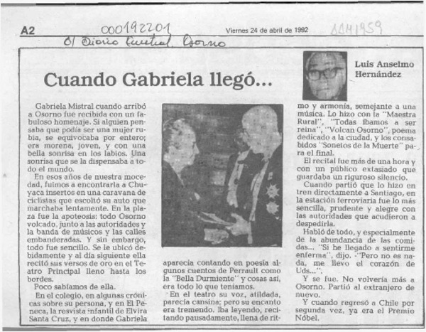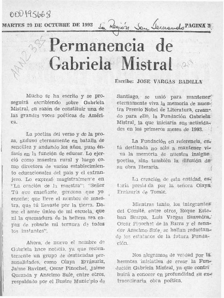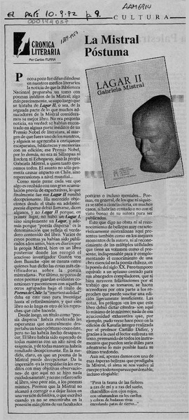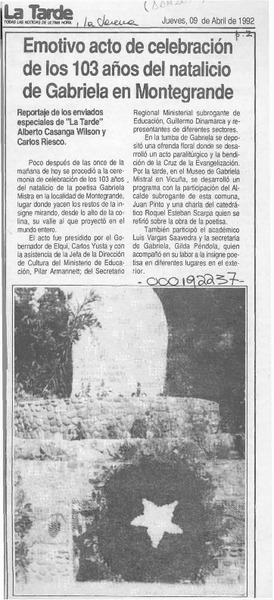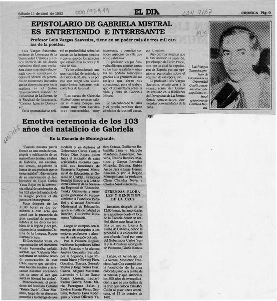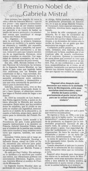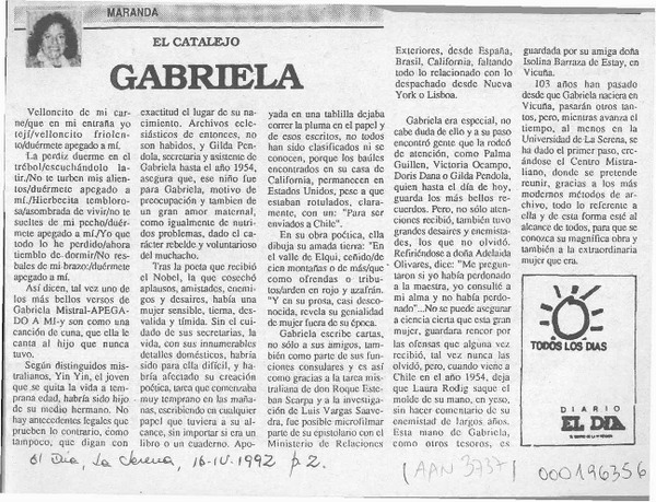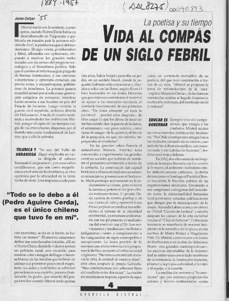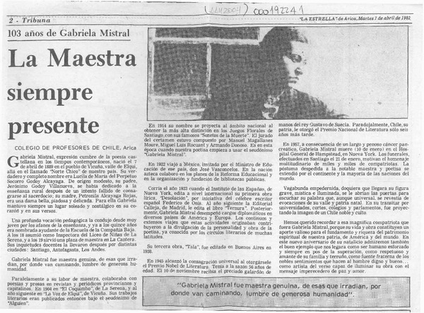 A 103 años del nacimiento de la divina Gabriela [artículo] Miguel Artidoro Pérez Aravena.