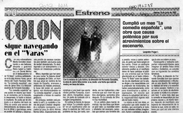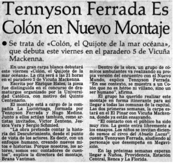 Agarran pa'l fideo a Colón en estreno del Teatro Nacional  [artículo].