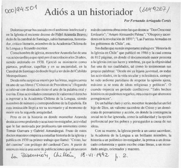 Adiós a un historiador [artículo] Fernando Arriagada Cortés.