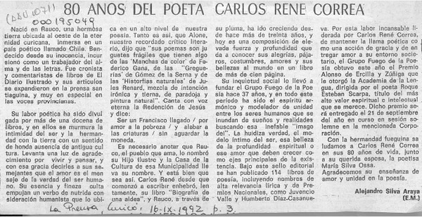 80 años del poeta Carlos René Correa  [artículo] Alejandro Silva Araya.