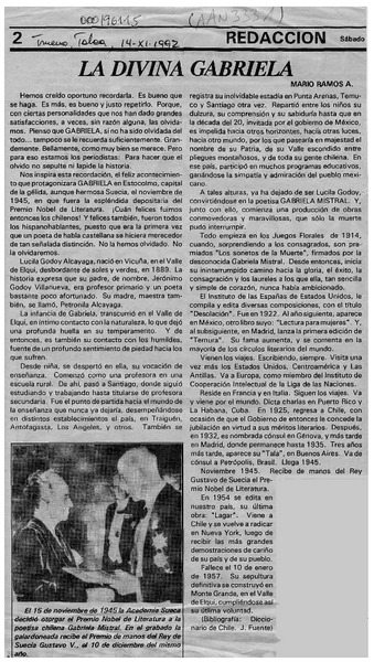 A 103 años del nacimiento de la divina Gabriela  [artículo] Miguel Artidoro Pérez Aravena.