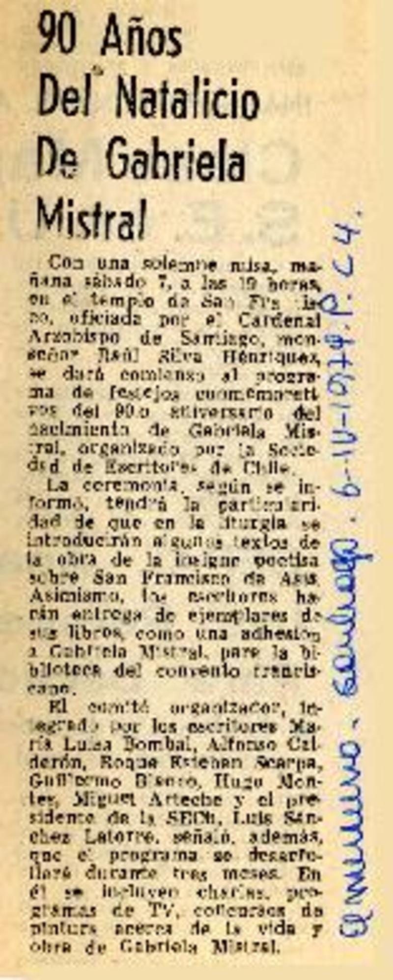 90 años del natalicio de Gabriela Mistral [artículo]