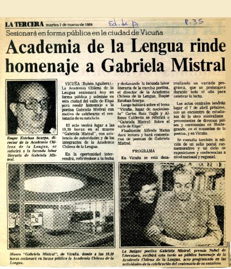 Academia de la Lengua rinde homenaje a Gabriela Mistral [artículo] La Tercera de la Hora (Diario : Santiago, Chile)-- mar. 7, 1989, p. 35 (Ed. de Provicncia) retr. .