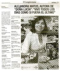 Alejandra Matus, autora de "Doña Lucía": "Vivo todos los días como si fuera el último" [artículo] / Patricio Sesnich Jr. El Longino (Diario : Iquique, Chile)-- ene. 22, 2014, p. 15 .
