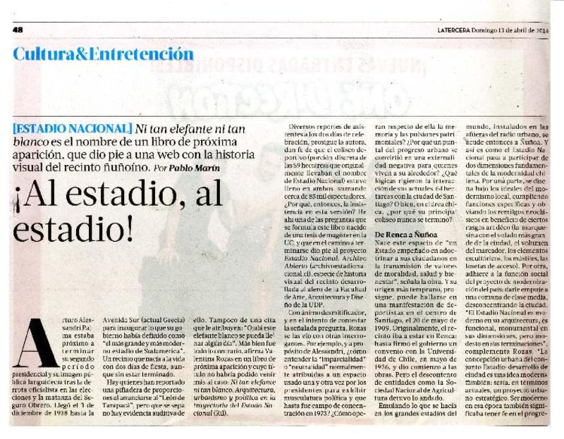 ¡Al estadio, al estadio! [artículo] / Pablo Marín La Tercera (Diario : Santiago, Chile)-- abr. 13, 2014, p. 48-49 .