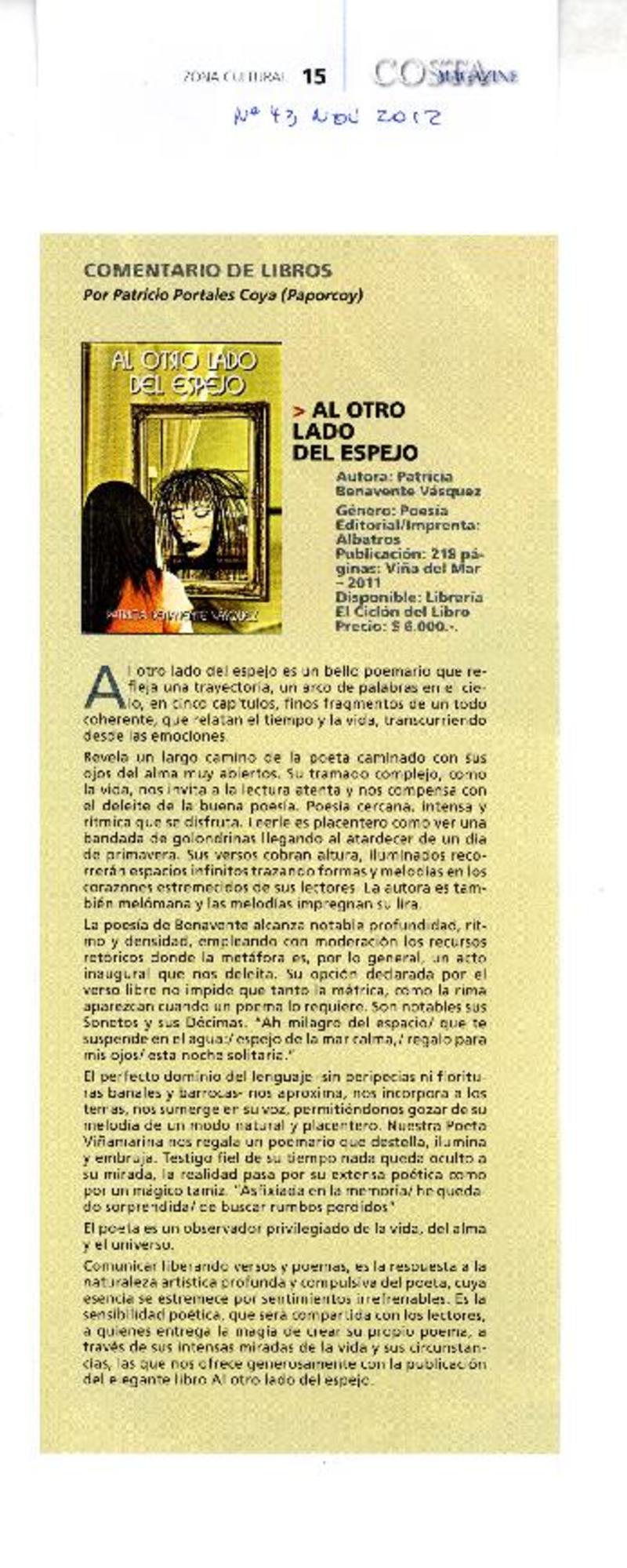 Al otro lado del espejo [artículo] / Patricio Portales Coya. Zona cultural (Revista : Chile)-- no. 43 (nov. 2012), p. 15. .