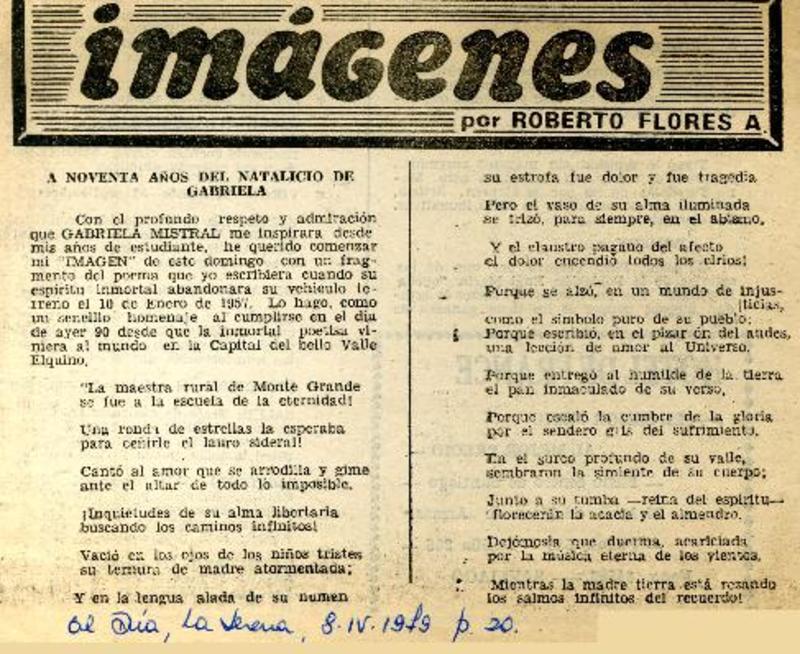 A noventa años del natalicio de Gabriela [artículo] El Día (diario : La Serena, Chile)-- abr. 8, 1979, p. 20. .
