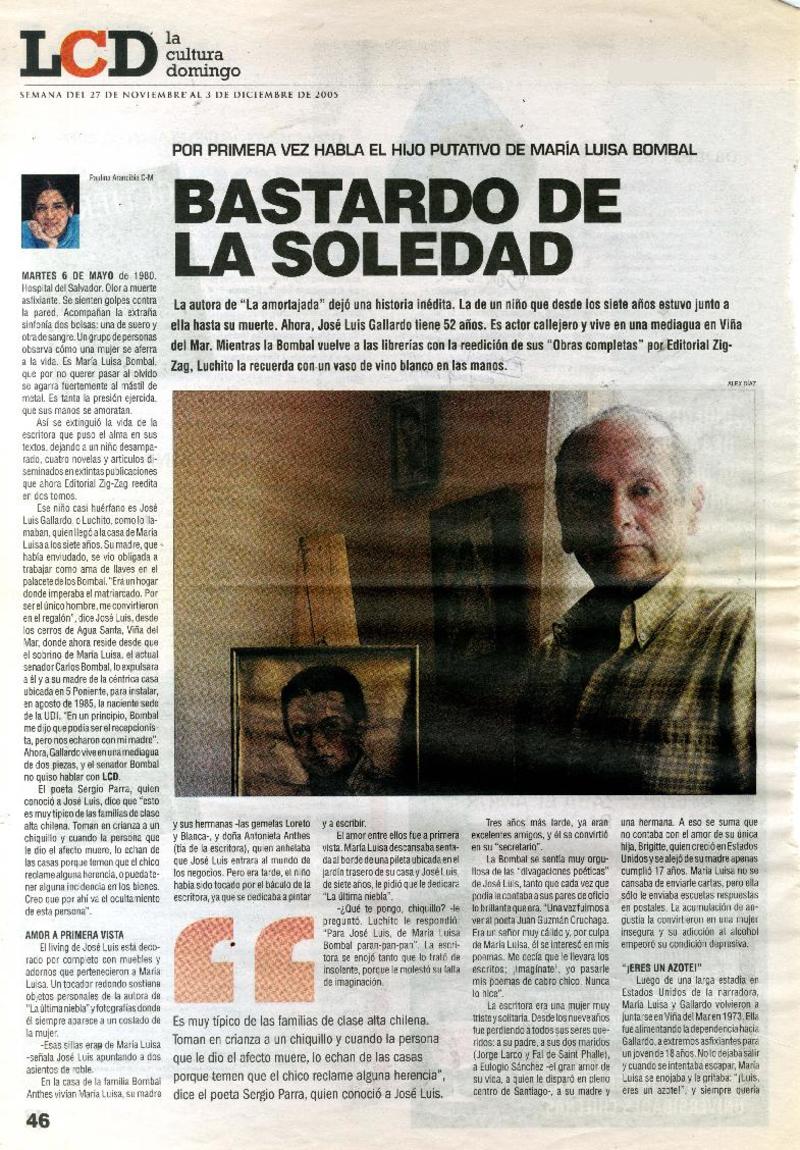 Bastardo de la soledad [artículo] / Paulina Arancibia C. M. La Nación Domingo (Diario : Santiago, Chile)-- dic. 3, 2005, p. 46-47 (suplemento "La cultura domingo") .