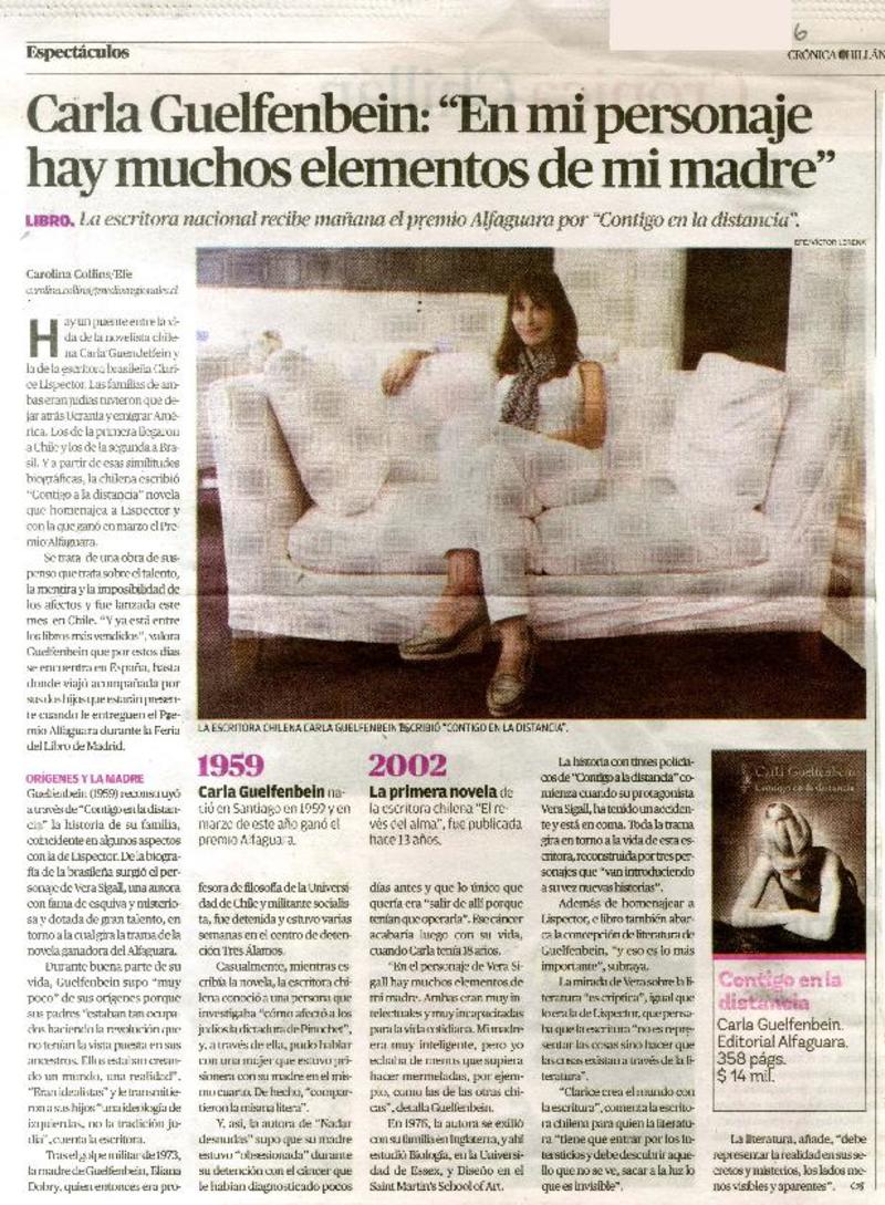 Carla Guelfenbein: "En mi personaje hay muchos elementos de mi madre" [artículo] / Carolina Collins. Crónica Chillán (Diario : Chillán, Chile)-- mayo 28, 2015, p. 27. .