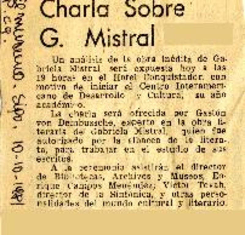 Charla sobre G. Mistral [artículo] El Mercurio (Santiago, Chile)-- abr. 10, 1979, p. C9. .