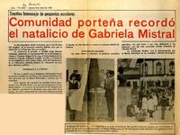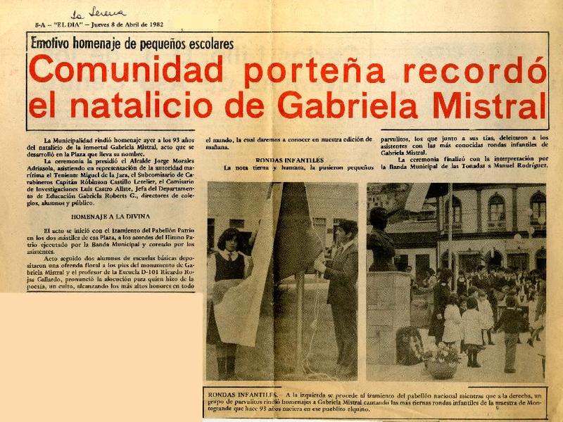 Comunidad porteña recordó el natalicio de Gabriela Mistral emotivo homenaje de pequeños escolares [artículo] : El Día (diario : La Serena, Chile)-- abr. 8, 1982, p. 8A. retr. .